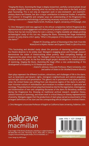 "Westgate's discussion of the plays and productions provides a wealth of theatre history as well as a rich cultural context for understanding it. Drawing with confidence on his knowledge of history and the relevant critical theory, Westgate makes his arguments clearly and persuasively. ... Staging the Slums, Slumming the Stage is a significant contribution to our understanding not only of American drama and theatre but also ofthe cultural and social history of the American Progressive Era." (Brenda Murphy, Modern Drama, Vol. 58, Winter, 2015)