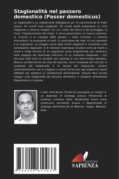 La stagionalità è un adattamento obbligatorio per la sopravvivenza di molte specie. Gli uccelli sono stagionali. Gli uccelli adulti presentano un ciclo stagionale in diverse funzioni, tra cui i colori del becco e del piumaggio, la muta, l'ingrassamento del corpo, il carico parassitario, la massa corporea, la crescita e lo sviluppo delle gonadi, i livelli ormonali, il sistema immunitario, la produzione di canti, la costruzione del nido, le cure parentali e la migrazione. La maggior parte degli eventi stagionali è incentrata sulla riproduzione stagionale. È di notevole importanza studiare come gli eventi a breve e lungo termine di un organismo siano programmati per verificarsi nella stagione più favorevole dell'anno. In un ambiente stagionale, i cicli luce-buio (LD) sono la variabile più coerente a una determinata latitudine. Diverse caratteristiche del ciclo LD naturale, come l'ampiezza del ciclo LD, la lunghezza del fotoperiodo e la durata del crepuscolo, variano sistematicamente con la stagione e quindi forniscono agli organismi spunti affidabili per adattarsi ai cambiamenti dell'ambiente. Questo libro include indagini sulla stagionalità del passero domestico in relazione all'ambiente fotoperiodico a Lucknow.