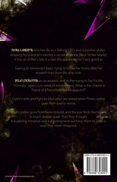 Flora Larkspur lives her life as a fashion CEO and a panther shifter. Keeping her panther's identity a secret while the Black Shifter Market is hot on shifter's tails is a task she apparently isn't very good at. Seeing as someone's been trying to follow her home after her research trips from the strip club. Dylan Enchanted, an ex-assassin wolf shifter trying to live his life "normally" again, is in need of employment. What is the chance a friend of a friend needs a bodyguard? Dylan's skills and fight-to-kill instinct are tested when Flora's stalker goes from bad to worse. Flora's stalker goes from tame to bold, and the pair finds themselves in much deeper water than they thought. A bubbling romance and a shocking twist will force them to grow in ways they never imagined. Cliffhanger free HEA Trigger warnings: Stalker, kidnapping, sexual content, knife and blood play/mention, death, torture, mentions of trafficking.