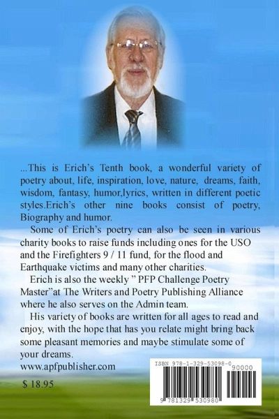 This is Erich's Tenth book, a wonderful variety of poetry about, life, inspiration, love, nature, dreams, faith, wisdom, fantasy, humor, lyrics, written in different poetic styles for all ages to Enjoy. It might bring back some pleasant memories and may stimulate some of your dreams,