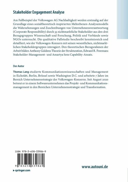 Am Fallbeispiel der Volkswagen AG Nachhaltigkeit werden erstmalig auf der Grundlage eines sozialtheoretisch inspirierten Mehrebenen-Analysemodells die Wahrnehmungen und Zuschreibungen von Unternehmensverantwortung (Corporate Responsibility) durch 33 nichtmarktliche Stakeholder aus den drei Bezugsgruppen Wissenschaft und Forschung, Politik und Verbände sowie NGOs untersucht. Die qualitative Fallstudie beschreibt kenntnisreich und detailliert, wie der Volkswagen-Konzern mit seinen wesentlichen, nichtmarktlichen Stakeholdergruppen interagiert. Den theoretischen Bezugsrahmen der Arbeit bilden Anthony Giddens Theorie der Strukturation, Edward R. Freemans Stakeholder-Management- und Amartya Sens Capability-Ansatz.