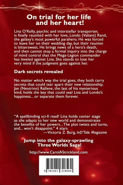 On trial for her life... and her heart! The exciting THREE WORLDS superhero romance saga continues! Lina O'Kelly, psychic and interstellar transporter, is finally reunited with her love, Londo (Valiant) Rand, the galaxy's most powerful parahero. He was forced to leave her on their wedding day, but their reunion is bittersweet. He brings news of a hero's death, and then cannot stop a formal inquiry into the charge of mind control that the Mega-Legion commander has leveled against Lina. She stands to lose her very mind if the judgment goes against her. Dark secrets revealed No matter which way the trial goes, they both carry secrets that could tear apart their new relationship. Jae (Neutrino) Rallene, the last of his mysterious kind, holds the key that could seal Lina and Londo's happiness... or keep them separated forever.