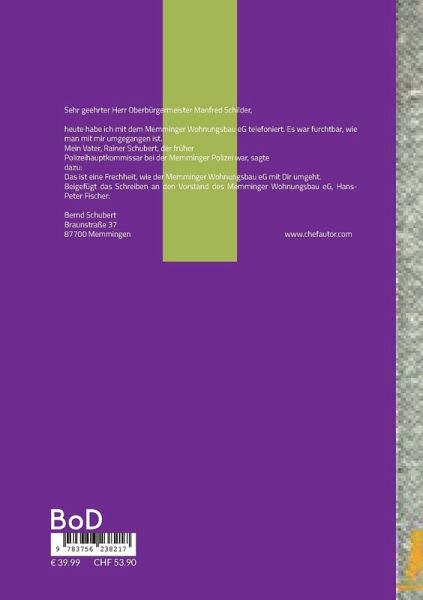Sehr geehrter Herr Oberbürgermeister Manfred Schilder,heute habe ich mit dem Memminger Wohnungsbau eG telefoniert. Es war furchtbar, wie man mit mir umgegangen ist.Mein Vater, Rainer Schubert, der früher Polizeihauptkommissar bei der Memminger Polizei war, sagte dazu:Das ist eine Frechheit, wie der Memminger Wohnungsbau eG mit Dir umgeht.Beigefügt das Schreiben an den Vorstand des Memminger Wohnungsbau eG, Hans-Peter Fischer:Bernd SchubertBraunstraße 3787700 Memmingengeb. 16.04.1977Memminger Wohnungsbau eGz. Hd. Herrn Fischer (Vorstand)87700 MemmingenBetreff: Frau M.Sehr geehrter Herr Schubert,vielen herzlichen Dank für Ihr Schreiben. Herr Oberbürgermeister Manfred Schilder hat mich gebeten Ihnen hier in dieser Angelegenheit zu antworten...Situation 2007Der Umzug in eine günstige Wohnung ist schon organisiert, die letzte Miete wurde von mir bezahlt und es bestehen keine Unstimmigkeiten mit meinem Vermieter, Herrn Steuerberater Bombe.Weswegen benötige ich einem Betreuer? Damit er mir sagt, was ich morgen essen soll, oder damit eine weitere Person beschäftigt ist, unnötig. Zum Schreiben von Fr. K., Frau der Oberarztes K., der mich vor 11 Jahren behandelte. Das Schreiben ist maßlos übertrieben. Übrigens fand das Gutachtengespräch an 2 Tagen in der geschlossenen Anstalt im Klinikum Memmingen statt.Das Drama beginnt.