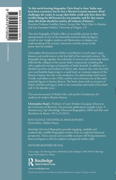 Christopher Read examines Stalin's contribution to and impact on Russian and world events in the first half of the twentieth century. The biography brings together the avalanche of sources and scholarship which followed the collapse of the system Stalin constructed, including the often neglected writings and speeches of Stalin himself. In addition to a detailed narrative and analysis of Stalin's rule, chapters also cover his early years and humble beginnings in a small town at a remote outpost of the Russian Empire, his role in the revolution, his relationships with Lenin, Trotsky and others in the 1920s, and his rise to become one of the most powerful figures in human history. The book closes with an account of Stalin's afterlife and legacy, both in the immediate aftermath of his death and in the decades since.