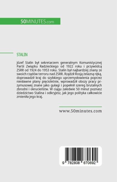 Józef Stalin by¿ sekretarzem generalnym Komunistycznej Partii Zwi¿zku Radzieckiego od 1922 roku i przywódc¿ ZSRR od 1924 do 1953 roku. Stalin by¿ najbardziej znany ze swoich rz¿dów terroru nad ZSRR. Rz¿dzi¿ Rosj¿ ¿elazn¿ r¿k¿, doprowadzi¿ kraj do szybkiego uprzemys¿owienia poprzez nies¿awne plany pi¿cioletnie, wprowadzi¿ obozy pracy przymusowej znane jako gu¿agi i pope¿ni¿ szereg brutalnych zbrodni i okrucie¿stw. W ci¿gu zaledwie 50 minut poznasz dziedzictwo Stalina i odkryjesz, jak jego polityka cäkowicie zmieni¿a jego kraj. Ta prosta i pouczaj¿ca ksi¿¿ka oferuje dok¿adne omówienie kluczowych momentów w krwawej karierze politycznej Stalina, w tym jego paktu o nieagresji z nazistowskimi Niemcami, przymusowej kolektywizacji wsi i brutalnych czystek. Zawiera równie¿ pe¿n¿ biografi¿, cenne wprowadzenie do kontekstu politycznego, spo¿ecznego i gospodarczego oraz ocen¿ wp¿ywu dyktatury Stalina, daj¿c ci wszystkie niezb¿dne informacje o cz¿owieku ze stali.