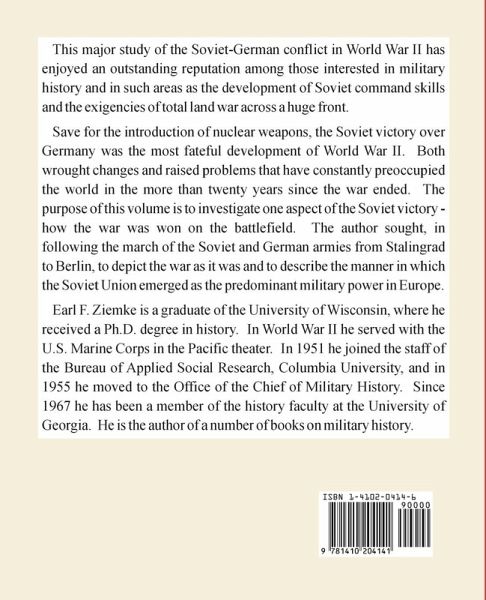This major study of the Soviet-German conflict in World War II has enjoyed an outstanding reputation among those interested in military history and in such areas as the development of Soviet command skills and the exigencies of total land war across a huge front. Save for the introduction of nuclear weapons, the Soviet victory over Germany was the most fateful development of World War II. Both wrought changes and raised problems that have constantly preoccupied the world in the more than twenty years since the war ended. The purpose of this volume is to investigate one aspect of the Soviet victory - how the war was won on the battlefield. The author sought, in following the march of the Soviet and German armies from Stalingrad to Berlin, to depict the war as it was and to describe the manner in which the Soviet Union emerged as the predominant military power in Europe. Earl F. Ziemke is a graduate of the University of Wisconsin, where he received a Ph.D. degree in history. In World War II he served with the U.S. Marine Corps in the Pacific theater. In 1951 he joined the staff of the Bureau of Applied Social Research, Columbia University, and in 1955 he moved to the Office of the Chief of Military History. Since 1967 he has been a member of the history faculty at the University of Georgia. He is the author of a number of books on military history.