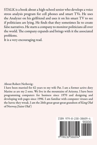 Stalk is a book about a high-school senior who develops a voice stress analysis program for cell phones and smart TVs. He uses the Analyzer on his girlfriend and uses it on his smart TV to see if politicians are lying. He finds that they sometimes lie to create false narratives. He starts a company to monitor politicians all over the world. The company expands and brings with it the associated problems. It is a very encouraging read.