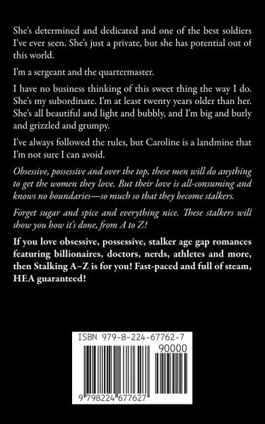 She's determined and dedicated and one of the best soldiers I've ever seen. She's just a private, but she has potential out of this world. I'm a sergeant and the quartermaster. I have no business thinking of this sweet thing the way I do. She's my subordinate. I'm at least twenty years older than her. She's all beautiful and light and bubbly, and I'm big and burly and grizzled and grumpy. I've always followed the rules, but Caroline is a landmine that I'm not sure I can avoid. Obsessive, possessive and over the top, these men will do anything to get the women they love. But their love is all-consuming and knows no boundaries-so much so that they become stalkers. Forget sugar and spice and everything nice. These stalkers will show you how it's done, from A to Z! If you love obsessive, possessive, stalker age gap romances featuring billionaires, doctors, nerds, athletes and more, then Stalking A-Z is for you! Fast-paced and full of steam, HEA guaranteed!