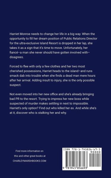 An entertaining start to a fresh new mystery series. Harriet Monroe needs to change her life in a big way. When the opportunity to fill her dream position of Public Relations Director for the ultra-exclusive Island Resort is dropped in her lap, she takes it as a sign that it's time to move. Unfortunately, her fiancé-a man she never should have gotten involved with-disagrees. Forced to flee with only a few clothes and her two most cherished possessions, Harriet heads to the island-and runs smack dab into trouble when she finds a dead man mere hours after her arrival. Adding insult to injury, she is the only possible suspect. Not even moved into her new office and she's already bringing bad PR to the resort. Trying to impress her new boss while suspected of murder makes settling in next to impossible. Harriet's only option? Find out who killed her ex. And while she's at it, discover who is stalking her and why.