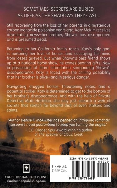 Sometimes, secrets are buried as deep as the shadows they cast... Still recovering from the loss of her parents in a mysterious carbon monoxide poisoning years ago, Katy McKim receives devastating news-her brother, Shawn, has disappeared and is presumed dead. Returning to her California family ranch, Katy's only goal is nurturing her love of horses and occupying her mind from losses grieved. But when Shawn's best friend shows up at a national horse show, he comes bearing gifts. Now in possession of more information surrounding Shawn's disappearance, Katy is faced with the chilling possibility that her brother is alive-and in serious danger. Navigating drugged horses, threatening notes, and a potential stalker, Katy is determined to get to the bottom of her brother's disappearance. And with the help of Private Detective Matt Hartman, she may just unearth a web of secrets that stretch far beyond that of even stalkers and saints. "Author Denise F. McAllister has penned an intriguing romantic suspense novel guaranteed to keep you turning the pages." -C.K. Crigger, Spur Award-winning author of The Speaker of Clovis Creek