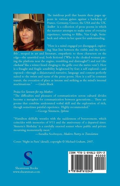 The insidious peril that haunts these pages appears in various guises against a backdrop of France, Germany, Greece, the USA and the UK. Stalker is a collection of prose poems in which the narrator attempts to make sense of everyday experience, turning to Rilke, Van Gogh, Steinbeck and others in her quest for understanding. "Here is a mind engaged yet disengaged, exploring 'that line between the visible and the invisible', steeped in art and literature, empathetic to those characters on the edge-the unsettled soul, both fictional ('Who is the cloaked woman pacing the platform near the engine, trembling and distraught?') and real (the clochard 'like a winter lizard clinging to the grille over the metro vent'). Here is a fraught and fragile sensibility heightened by fear; a self explored-and exposed-through a disjunctured narrative, language and content perfectly suited to the twists and turns of the prose poem. Here is a self in constant transit, the evocation of place as intense and striking as the mind's internal machinations." -Linda Black
