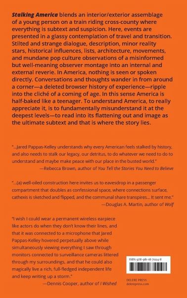 Stalking America blends an interior/exterior assemblage of a young person on a train riding cross-county where everything is subtext and suspicion. Here, events are presented in a glassy contemplation of travel and transition. Stilted and strange dialogue, description, minor reality stars, historical influences, lists, architecture, movements, and mundane pop culture observations of a misinformed but well-meaning observer montage into an internal and external reverie. In America, nothing is seen or spoken directly. Conversations and thoughts wander in from around a corner-a deleted browser history of experience-ripple into the cliché of a coming of age. In this sense America is half-baked like a teenager. The protagonist obsesses over historical references to nude bathers, anarchist colonies, reality television, communes, volcanic eruptions, and songs in a playlist trying to understand a certain aspect of America through observations and false epiphanies. A vacated puzzle attempts to undo itself while each piece ploddingly re-assembles with the assurance of the train ride as elements come into proximity. To understand America, to really appreciate it, is to fundamentally misunderstand it at the deepest levels-to read into its flattening out and image as the ultimate subtext and that is where the story lies.