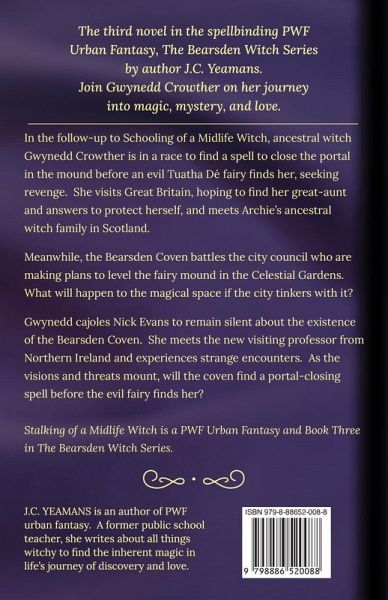 Join Gwynedd Crowther on her journey into magic, mystery, and love. Bearsden's resident ancestral witch Gwynedd Crowther searches for solutions to her deadly fairy problem in the third novel in The Bearsden Witch Series by author J.C. Yeamans! Reviewers have described the series as "a story that will enthrall and ensnare the reader" with a "strong female character, magic, romance (Scotsman-need I say more), mystery, and a great story arc." In the follow-up to Schooling of a Midlife Witch, ancestral witch Gwynedd Crowther is in a race to find a spell to close the portal in the mound before an evil Tuatha Dé fairy finds her, seeking revenge. She visits Great Britain, hoping to find her great-aunt and answers to protect herself, and meets Archie's ancestral witch family in Scotland. Meanwhile, the Bearden Coven battles the city council who are making plans to level the fairy mound in the Celestial Gardens. What will happen to the magical space if the city tinkers with it? Gwynedd cajoles Nick Evans to remain silent about the existence of the Bearsden Coven. She meets the new visiting professor from Northern Ireland and experiences strange encounters. As the visions and threats mount, will the coven find a portal-closing spell before the evil fairy finds her?