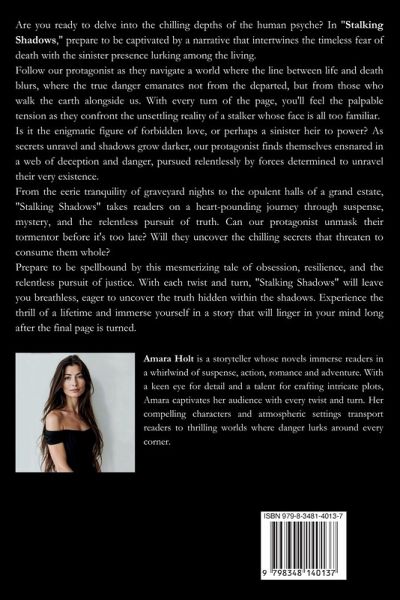 Are you ready to delve into the chilling depths of the human psyche? In "Stalking Shadows," prepare to be captivated by a narrative that intertwines the timeless fear of death with the sinister presence lurking among the living. Follow our protagonist as they navigate a world where the line between life and death blurs, where the true danger emanates not from the departed, but from those who walk the earth alongside us. With every turn of the page, you'll feel the palpable tension as they confront the unsettling reality of a stalker whose face is all too familiar. Is it the enigmatic figure of forbidden love, or perhaps a sinister heir to power? As secrets unravel and shadows grow darker, our protagonist finds themselves ensnared in a web of deception and danger, pursued relentlessly by forces determined to unravel their very existence. From the eerie tranquility of graveyard nights to the opulent halls of a grand estate, "Stalking Shadows" takes readers on a heart-pounding journey through suspense, mystery, and the relentless pursuit of truth. Can our protagonist unmask their tormentor before it's too late? Will they uncover the chilling secrets that threaten to consume them whole? Prepare to be spellbound by this mesmerizing tale of obsession, resilience, and the relentless pursuit of justice. With each twist and turn, "Stalking Shadows" will leave you breathless, eager to uncover the truth hidden within the shadows. Experience the thrill of a lifetime and immerse yourself in a story that will linger in your mind long after the final page is turned.