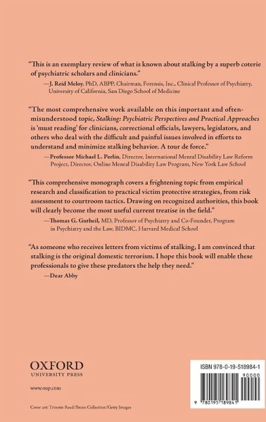 Over the last two decades, stalking has received increasingly widespread attention. The establishment of anti-stalking legislation has helped to spur interest in stalking research and the forensic assessment of stalkers. Popular representations of stalking have made the public more aware of this phenomenon. It has long been the responsibility of mental health professionals to provide assessments of and treatment for stalkers and their victims, and as criminal cases involving defendants charged with stalking become more common, it is now also the responsibility of legal professionals to be knowledgeable about psychiatric aspects of stalking behavior and the risks that so often must be minimized through legal action or a combination of clinical and legal interventions. This volume provides a thorough overview of current scientific and clinical research about stalking, along with practical guidance and original commentary from the Psychiatry and the Law Committee of the Group for the Advancement of Psychiatry, an organization recognized for its contributions to mental health literature. In addition to covering the most widely discussed scientific topics related to stalking, including classification of stalking behaviors, risk assessment and risk management of stalkers, and the stalking experience from the perspective of victims, this book examines celebrity and special target stalking, cyberstalking, forensic assessment, and juvenile and adolescent stalking. Stalking: Psychiatric Perspectives and Practical Approaches provides a novel and comprehensive contribution to a field in need of an up-to-date text, written from the vantage point of forensic psychiatrists who encounter stalkers and their victims in their distinct roles as treatment providers and forensic evaluators. The prism of stalking and the risks involved continue to fascinate and frighten. In pursuit of rounded coverage, the authors have incorporated findings from numerous studies and analyzed these findings from several theoretical perspectives. Every chapter has been written from the vantage point of a committee of nationally recognized forensic psychiatrists who offer their perspectives on this fascinating but complex topic. Mental health professionals, members of the judiciary, law enforcement professionals, media personnel, and the public will no doubt find this text to be an informative and useful resource.