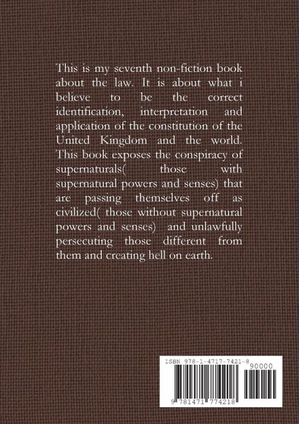 This is my seventh non-fiction book about the law. It is what I believe to be the correct identification, interpretation and application of the constitution of the United Kingdom and the world. This book exposes the conspiracy of supernaturals(those with supernatural powers and senses) that are passing themselves off as civilized( those without supernatural powers and senses) and unlawfully persecuting those different from them and creating hell on earth.