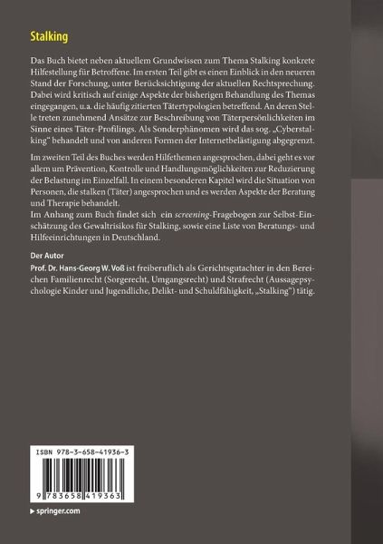Das Buch bietet neben aktuellem Grundwissen zum Thema Stalking konkrete Hilfestellung für Betroffene. Im ersten Teil gibt es einen Einblick in den neueren Stand der Forschung, unter Berücksichtigung der aktuellen Rechtsprechung. Dabei wird es kritisch zu einigen Aspekten der bisherigen Behandlung des Themas eingegangen, u.a. die häufig zitierten Tätertypologien betreffend. An deren Stelle treten zunehmend Ansätze zur Beschreibung von Täterpersönlichkeiten im Sinne eines Täter-Profiling. Als Sonderphänomen wird das sog. "Cyberstalking" behandelt und von anderen Formen der Internetbelästigung abgegrenzt. Im zweiten Teil des Buches werden Hilfethemen angesprochen. Dabei geht es vor allem um Prävention, Kontrolle und Handlungsmöglichkeiten zur Reduzierung der Belastung im Einzelfall. Auch das Thema von Personen, die stalken (Täter) angesprochen und behandelt werden Aspekte der Beratung und Therapie behandelt. Im Anhang zum Buch findet sich ein screening-Fragebogen zur Selbst-Einschätzung des Gewaltrisikos für Stalking, sowie eine Liste von Beratungs- und Hilfeeinrichtungen in Deutschland.