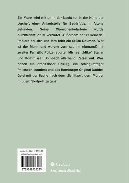Ein Mann wird mitten in der Nacht tot in der Nähe der "Arche", einer Anlaufstelle für Bedürftige, in Altona gefunden. Seine Oberschenkelarterie wurde durchtrennt; er ist verblutet. Außerdem hat er keinerlei Papiere bei sich und ihm fehlt ein Stück Daumen. Wer ist der Mann und warum vermisst ihn niemand? Ihr zweiter Fall gibt Polizeireporter Michael "Mike" Staller und Kommissar Bombach allerhand Rätsel auf. Was haben ein arbeitsloser Chirurg, ein schlagkräftiger Philosophiestudent und das Hamburger Original Daddel-Gerd mit der Suche nach dem "Schlitzer", dem Mörder mit dem Skalpell, zu tun?…mehr