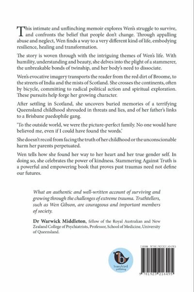 This intimate and unflinching memoir explores Wen's struggle to survive, and confronts the belief that people don't change. Through appalling abuse and neglect, Wen finds a way to a very different kind of life, embodying resilience, healing and transformation. The story is woven through with the intriguing themes of Wen's life. With humility, understanding and beauty, she delves into the plight of a stammerer, the unbreakable bonds of twinship, and her body's need to dissociate. Wen's evocative imagery transports the reader from the red dirt of Broome, to the streets of India and the mists of Scotland. She crosses the continents, often by bicycle, committing to radical political action and spiritual exploration. These pursuits help forge her growing character. After settling in Scotland, she uncovers buried memories of a terrifying Queensland childhood shrouded in threats and lies, and of her father's links to a Brisbane paedophile gang. 'To the outside world, we were the picture-perfect family. No one would have believed me, even if I could have found the words.' She doesn't recoil from facing the truth of her childhood or the unconscionable harm her parents perpetuated. Wen tells how she found her way to her heart and her true gender self. In doing so, she celebrates the power of kindness. Stammering Against Truth is a powerful and empowering book that proves past traumas need not define our futures.