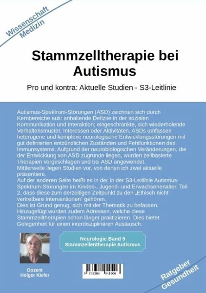 In diesem Buch wird die Möglichkeit beschrieben, neurologische Erkrankungen und insbesondere (ASD) Autismus-Spektrum-Störungen mithilfe von Stammzellen zu behandeln. Dabei wird auch auf die S3-Leitlinie Autismus-Spektrum-Störungen Bezug genommen. In der Einführung werden zudem folgende Themen besprochen: Was ist unter Stammzell-Therapie zu verstehen? Beispiele für medizinische Anwendungen Grundsätzliche Informationen zu Autismus-Spektrum-Störungen (ASDs) Stammzellen für neurologische Erkrankungen Der therapeutischen Wirkung zugrunde liegende Mechanismen Arten von StammzellenKlinische Studien zur Stammzelltransplantation bei ASD sind von entscheidender Bedeutung, um die Sicherheit (in erster Linie) und die Wirksamkeit der Zelltherapie zu bestätigen. Derzeit wurden mehrere klinische Studien durchgeführt, um die Sicherheit und Wirksamkeit der Behandlung von Autismus mit Stammzellen nachzuweisen. Erfahren Sie jetzt mehr über die Ergebnisse.