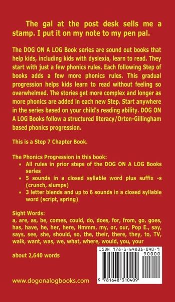 This book has about 2,640 words. The DOG ON A LOG Book series helps kids, including kids with dyslexia, learn to read. They are sound out books that start with just a few phonics rules. Each following Step of books adds a few more phonics rules and sight words. This gradual progression helps kids learn to read without feeling so overwhelmed. Start anywhere in the series based on your child's reading skills. The word list below will help you decide where in the series your child should start. Printable game boards, flashcards, handwriting sheets, and more are available to for additional practice. Information on the printables is provided in each book. The (purple) Let's GO! books have fewer words for new or less confident readers. The (red) chapter books are longer for more reading practice. Kids enjoy these stories that get more complex and longer as more phonics are added throughout the series. Books can be purchased individually or as collection volumes. This is an individual Step 7 Chapter Book. Additional information on using this series is available in the digital book HOW TO USE DECODABLE BOOKS TO TEACH READING. DOG ON A LOG Books follow an Orton Gillingham/systematic-phonics progression. DOG ON A LOG "What Step Should We Start With?" Word List Have your child read the following words. If they can't read every word in a Step, that is probably the step they should start with. For some kids, you may want to start at an earlier Step so they can build confidence in their reading ability. Step 1 fin, mash, sock, sub, cat, that, Dan's Step 2 less, bats, tell, mall, chips, whiff, falls Step 3 bangs, dank, honk, pings, chunk, sink, gong, rungs Step 4 silk, fluff, smash, krill, drop, slim, whisk Step 5 hunch, crate, rake, tote, inch, mote, lime Step 6 child, molts, fold, hind, jolt, post, colds Step 7 strive, scrape, splint, twists, crunch, prints, blend Step 8 finish, denim, within, bathtub, sunset, medic, habit Step 9 hundred, goldfinch, tree, wheat, inhale, play, Joe Step 10 be, remake, spry, repeat, silo, sometime, pinwheel Step 11 far, north, spire, turn, inhabit, calculate, Wyoming Many early reader books or leveled books are written so they cannot be sounded out. Kids often struggle and grow frustrated when they can't sound out the words. However, kids who have been taught the phonics and sight words in DOG ON A LOG Books can be proud when they are able to sound out and read almost every word. Paper books are optimized for learners with dyslexia. They have cream colored paper, black and white images, and large Verdana font. Research has shown Verdana is one of the most dyslexia-friendly fonts. More DOG ON A LOG Books: DOG ON A LOG Pup Books ---Before the Squiggle Code (Pre-Reading Skills) ---The Squiggle Code (Learning Letters and Words) ---Kids' Squiggles (First Stories) DOG ON A LOG Parent and Teacher Guides ---Teaching a Struggling Reader: One Mom's Experience with Dyslexia ---How to Use Decodable Books to Teach Reading Relevant portions of the DOG ON A LOG Phonics Progression (Scope and Sequence) and the Quick Assessment Tool ("What Step Should We Start With?" Word List) are inside each book. WATCH FOR MORE STEPS AND BOOKS COMING SOON