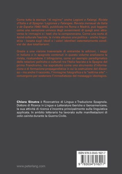 Come tutta la stampa «di regime» anche Legioni e Falangi. Rivista d¿Italia e di Spagna / Legiones y Falanges. Revista mensual de Italia y de España (1940¿1943), pubblicata tra Roma e Madrid, può leggersi come una narrazione univoca degli avvenimenti di quegli anni attraverso le immagini e i testi che la componevano. Come una sorta di koiné culturale fascista, la rivista attuava una politica ¿ anche lingüística ¿ basata sugli ideali e i valori identitari ostentatamente condivisi dai due totalitarismi. Grazie a una visione trasversale di entrambe le edizioni, i saggi in italiano e in spagnolo contenuti in questo volume analizzano la rivista, ricalcandone il bilinguismo, come un esempio paradigmático delle relazioni politiche e culturali tra l¿Italia fascista e la Spagna del primo Franchismo, ma soprattutto come uno strumento d¿informazione e di formazione propagandistica in cui la costruzione del discorso ¿ ma anche il racconto, l¿immagine fotografi ca e la «settima arte» ¿ convergono per sostenere l¿immediatezza del messaggio ideologico. Como toda prensa «de régimen» también Legioni e Falangi. Rivista d'Italia e di Spagna / Legiones y Falanges. Revista mensual de Italia y de España (1940 ¿ 1943), que se publicó paralelamente entre Roma y Madrid, puede leerse como una narración uniforme de los acontecimientos de la época gracias a las imágenes y a los textos que la componían. Lugar privilegiado donde se reunía lo más destacado de la cultura y de la política de ambos países, gracias al bilingüismo y a la traducción en la revista se concretaba una política ¿ también lingüística- basada en los ideales y en los valores aparentemente compartidos por los dos totalitarismos. Desde un enfoque polifacético que abarca ambas ediciones, los ensayos in italiano y en español recogidos en este volumen estudian la revista Legioni e Falangi/Legiones y Falanges no solo como un modelo de las relaciones culturales y políticas entre la Italia fascista y la España de la posguerra, sino también como uno de los medios de informac ión y formación propagandística donde todo contribuía a reafirmar el mensaje ideológico y su pronta recepción.