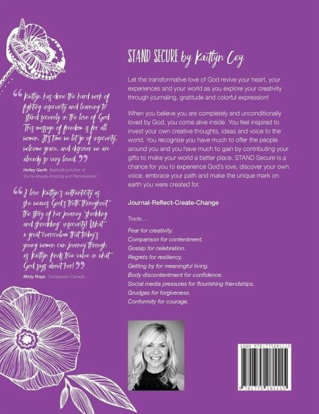 Let the transformative love of God revive your heart, experiences and your world as you journey through the STAND Secure devotional book. Kaitlyn combines story-telling, reflective journaling, gratitude and colorful expression to inspire you to know God's love. When you believe you are completely and unconditionally loved by God, you come alive inside. You feel inspired to invest your own creative thoughts, ideas and voice to the world. You recognize you have much to offer the people around you and you have much to gain by contributing your gifts to make your world a better place. STAND Secure is a chance for you to experience God’s love, discover your own voice, embrace your path and make the unique mark on earth you were created for. Journal-Reflect-Create-Change Trade... Fear for creativity. Comparison for contentment. Gossip for celebration. Regrets for resiliency. Getting by for meaningful living. Body discontentment for confidence. Social media pressures for flourishing friendships. "Kaitlyn has done the hard work of fighting insecurity and learning to stand securely in the love of God. This message of freedom is for all women. It's time we let go of insecuirty, welcome grace, and discover we are already so very loved." - Holley Gerth, Bestselling Author of You're Already Amazing and Fiercehearted "I love Kaitlyn's authenticity as she weaves God's truth throughout the story of her journey 'shedding and shredding' insecurity! What a great curriculum that today's young women can journey through as Kaitlyn finds true value in what God says about her!" - Misty Ropp, Compassion Canada