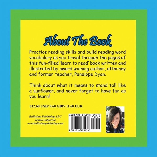 Follow your dreams! Reach toward the sun! Stand tall like a sunflower! Make sure you always lend others a helping hand to show others that you care! Never, ever forget to offer words of kindness when someone is in despair; because even the elephant knows this is just, right and good. And a host of fun and familiar Penelope Dyan characters all agree! And while you are thinking about what it means to stand tall like a sunflower, you can practice your reading skills and build your reading word vocabulary as you travel through each page of this fun, 'learn to read' book, written and illustrated by the award winning author, attorney and former teacher, Penelope Dyan, that is filled with word recognition, and word repetition and rhyme! However, please don't forget to have fun as you learn, and as you turn each and every page of this fun-filled 'learn to read' book; because learning should always be fun! Because (as everyone knows) if you don't have fun learning, you won't love to learn! And for even more learning fun, you can go to Bellissimavideo's YouTube channel and watch the free, fun music video that goes with this book!