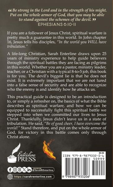 If you are a follower of Jesus Christ, spiritual warfare is pretty much a guarantee in this world. In John chapter 16, Jesus tells his disciples, "In the world you WILL have tribulation." A life-long Christian, Sarah Enterline draws upon 25 years of ministry experience to help guide believers through the spiritual battles they are facing as pilgrims in this world. Whether you are a pastor, ministry leader, teacher, or a Christian with a typical 8-to-5 job, this book is for you. The devil's biggest lie is that he does not exist. It is extremely important that we are not lured into a false sense of security and are able to recognize who the enemy is and identify how he attacks us. This practical guide is designed to be an introduction to, or simply a refresher on, the basics of what the Bible describes as spiritual warfare, and how we can be equipped to successfully fight this spiritual battle we stepped into when we committed our lives to Jesus Christ. Thankfully, Jesus didn't leave us in a state of tribulation. He said, "Be of good cheer, I have overcome the world!" Stand therefore, and put on the whole armor of God, for victory in this battle comes only through Christ alone.