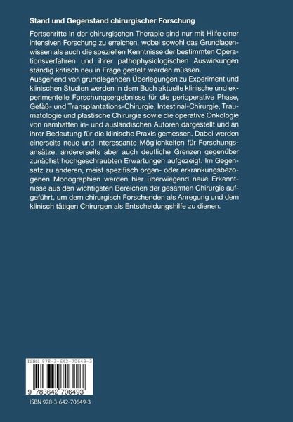 1. Grundlagen.- Forschungsinhalt und Forschungsplanung im Rahmen der medizinischen, speziell der chirurgischen Forschung.- Der Tierversuch in der chirurgischen Forschung.- Die Bedeutung retrospektiver und prospektiver Studien für die klinische Forschung.- Behinderung der chirurgischen Forschung durch Recht?.- 2. Perioperative Aspekte.- Der Chirurg in der Intensivmedizin.- Postaggressionsstoffwechsel - Versuch einer Standortbestimmung.- Möglichkeiten und Grenzen der perioperativen künstlichen Ernährung.- Neue Trends in der Schockforschung.- Moderne Aspekte des Multiorganversagens.- Pathobiochemie und Chirurgie: Neue Ansätze zur Diagnostik und Therapie schwerer entzündlicher Erkrankungen.- Die maligne Hyperthermie.- Volatile Anästhetika - neue Aspekte.- 3. Gefäß- und Transplantationschirurgie.- a) Gefäßchirurgie.- Die chirurgische Behandlung des Bland-White-Garland-Syndroms unter Rekonstruktion des Zweikoronargefäßsystems.- Kontroversen und Grenzen in der Gefäßchirurgie.- Gefäßersatz.- Die Mikrochirurgie als Erweiterung der operativen Therapie.- Aktuelle Chirurgie bei portaler Hypertension.- b) Transplantationschirurgie.- Organkonservierung: Grundlagen, Entwicklungen, Perspektiven.- Gedanken zur Herztransplantation.- Stand der klinischen und experimentellen Lebertransplantation.- Die chirurgische Behandlung des Diabetes mellitus Typ I.- 4. Thoraxchirurgie.- Therapie des Bronchialkarzinoms.- Grenzen der chirurgischen Behandlung des Bronchialkarzinoms.- Die Kontinuitätsresektion der Trachea.- 5. Gastroenterologie.- Interaktion chirurgisch-gastroenterologischer Forschung: Entwicklung der Theoretischen Chirurgie.- Neue Entwicklung in der gastrointestinalen Endokrinologie.- Chirurgische Ulkustherapie im Wandel der Zeit.- Forschungsstand beim peptischenUlkus.- Dumpingsyndrom und gastrointestinale Hormone.- Entzündliche Darmerkrankungen: Aktueller Stand der chirurgischen Therapie.- Anastomosentechniken im Gastrointestinaltrakt.- Funktionsstörungen des Gastrointestinaltrakts.- 6. Traumatologie, plastische Chirurgie.- Operative versus konservative Knochenbruchbehandlung.- Klassifikation und therapeutische Prioritäten beim Polytrauma.- Verletzungen des Schultereckgelenks.- Die wissenschaftliche Basis einer "aggressiven Traumatologie" bzw. der frühen Totalversorgung Verletzter.- Biomechanik - Knochenbruchheilung - Biomaterialien: Ein aktuelles Therapiekonzept.- Neuentwicklungen in der plastischen Chirurgie für die Rekonstruktion traumatischer Defekte.- Down-Syndrom: 8 Jahre plastisch-chirurgische Korrektureingriffe im mongoloiden Gesicht - cui bono?.- 7. Onkologie.- Der Stellenwert ultraradikaler Operationen in der Onkologie.- Gesichertes und Ungesichertes zur Einschränkung der Radikalität in der Krebschirurgie.- Wertigkeit der Lymphknotendissektion bei Tumoren des oberen Gastrointestinaltrakts.- Chirurgische Onkologie des unteren Gastrointestinaltrakts.- Der Stellenwert der Chirurgie bei der Therapie von Tumormetastasen.- Die chirurgische Therapie pathologischer Frakturen und Osteolysen bei Skelettmetastasen: Behandlungskonzept und Ergebnisse.- Indikation zur Kryochirurgie beim inkurablen Rektumkarzinom.