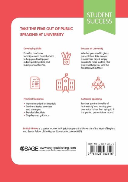 This much-needed book will be highly valued by very many university students and indeed by all sorts of other people who have occasion to stand up in public and speak. It is terrific to have such authoritative words of wisdom and experience from a practitioner who has faced and overcome the problems that very many people share about speaking in public. I too remember the intense dread I experienced as a teenager when it was my turn to read out the biblical extract to school assembly for four days! This was probably the most daunting experience of my life, and it took me a great deal of time, practice and patience to become able to walk in happily to do conference keynotes, and to enjoy reactions, and indeed play with the audience. Fear of public speaking is a widely shared phenomenon, yet is relatively rarely addressed properly at university, where students can suffer enormously when the time comes round for them to stand up and be heard. It s every bit as serious a problem as exam stress, and affects the success of at least as many students. At last, here is the book which comforts, guides, and addresses the fears and emotions which very many people experience with speaking. Rob Grieve shares his passion, enthusiasm and experience on every page. A must for students and many others. Phil Race