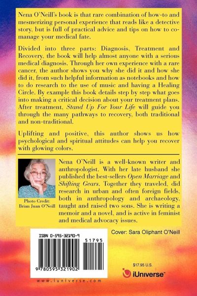 Nena O'Neill's book is that rare combination of how-to and mesmerizing personal experience that reads like a detective story, but is full of practical advice and tips on how to co-manage your medical fate. Divided into three parts: Diagnosis, Treatment and Recovery, the book will help almost anyone with a serious medical diagnosis. Through her own experience with a rare cancer, the author shows you why she did it and how she did it, from such helpful information as notebooks and how to do research to the use of music and having a Healing Circle. By example this book details step by step what goes into making a critical decision about your treatment plans. After treatment, Stand Up For Your Life will guide you through the many pathways to recovery, both traditional and non-traditional. Uplifting and positive, this author shows us how psychological and spiritual attitudes can help you recover with glowing colors.
