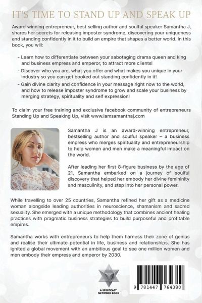 Award winning entrepreneur, best selling author and soulful speaker Samantha J, shares her secrets for releasing imposter syndrome, discovering your uniqueness and standing confidently in it to build an empire that shapes a better world. In this book, you will - Learn how to differentiate between your sabotaging drama queen and king and business empress and emperor, to attract more clients!¿ - Discover who you are, what you offer and what makes you unique in your industry so you can get booked out standing confidently in it! - Gain divine clarity and confidence in your message right now to the world, and how to release imposter syndrome to grow and scale your business by merging strategy, spirituality and self expression! To claim your free training and exclusive facebook community of entrepreneurs Standing Up and Speaking Up, visit¿www.iamsamanthaj.com