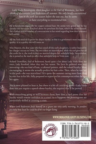 Lady Viola Bennington, third daughter to the Earl of Westmont, has been thinking of a certain Lord Baderston all summer. She only briefly encountered him in the park last season before she was out, but he seems to have everything to recommend him. He is handsome, especially his copper-colored hair. He seems very genial and he has already told her sister Rosalind about his penchant for ham, which she adores herself. She's had an untold number of conversations in her mind regarding how their romance will unfold. All the lord need do is prove his abject loyalty, as that is a gentleman's most important quality. It is a quality she will insist on. Miss Mayton, the dear aunt who has raised all the earl's daughters, is rather buoyed by her charges' success in Town. The two eldest are married and, while the earl gives her all the credit for it, the truth is they are married despite her unhelpful help. Nevertheless, she is poised at the mark to offer that unhelpful help to Viola now. Roland Trewellian, Earl of Baderston, heard quite a lot about Lady Viola from her sister, Lady Rosalind, when they met last season. The facts he gathered were very interesting-she was fond of ham, a talented painter, and she valued loyalty. Most encouraging, it seems she actually prefers his hair color. Then, when he saw her in the park-she was marvelous! He's spent the summer eating more ham than he ever has in his life, fully prepared to report on his consumption when he sees her again. She is most pleased to hear it, but there is a bit of a sticking point-Lady Viola does not just require a speech about loyalty, she requires that it be proved. With everything going so well between them, how does a lord prove that his loyalty would remain unshaken in a crisis? As it happens, the Benningtons are particularly skilled at creating a crisis. When Lord Baderston finds himself on a green one very early morning, he ponders precisely how loyal he could be if he's no longer living.