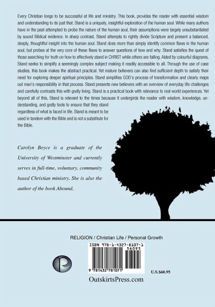 Do you find yourself becoming disillusioned by the challenges of the age? Have you observed the signs of mental unfitness in your own life or the lives of others around you? As a Christian do you find your biblical ideals increasingly becoming out of sync with everyday reality? Or do you find yourself defeated before the day has begun? Author Carolyn Boyce, in this intriguing study on the soul, clearly presents what every believer should understand in order to effectively cope with and over come the challenges of the age. By exploring the soul, you will learn how to recognize common areas of struggle which originate in the heart, mind or will. You will also analyze the lives of biblical characters in terms of the strengths or weaknesses evident in their soul. Through the use of case studies and colourful diagrams, abstract concepts can be easily grasped and incorporated into everyday Christian living. This book does not merely seek to increase the reader's knowledge but rather to aid the Christian's understanding of key biblical concepts. Stand has been conveniently organized into three sections. Section 1 In this section, the author defines essential terms, presents an overview of the book, and reviews basic biblical concepts relevant to later sections of the book. Section 2 Section two is itself divided into three parts, covering the heart, mind and will. Under the topic the heart, the author explores the structure, location, contents and condition of the human heart. Bitterness, the effect of the emotions on physical health, and how to successfully protect the heart are some of the other issues covered under this topic. Under the topic the mind, the author contrasts carnal thinking with sound thinking carefully making a strong case for sound thinking. As readers progress through this topic, they gain insight into GOD's design for the sound mind and learn how to renew the sound mind. Under the topic the will, several practical examples have been given to demonstrate the role of man's will in promoting stability and godliness in believers. Of particular importance is the chapter, The Weapons of our warfare where the author presents an interesting account of the nature of conflict in the physical and spiritual realms. The biblical alternative to successfully handling conflicts is explored through an assessment of the spiritual weapons. Section 3 This section explores the relevance of soberness in the Christian%u2019s life. Through the scenarios depicted, the reader will readily appreciate how essential the principles of balance are for standing effectively as a Christian. Relevance of the book: Stand is an essential read for all believers in the LORD JESUS CHRIST regardless of age or spiritual maturity. The book is deeply thought provoking and uniquely refreshing. Stand is very well suited to the times in which we live. It is a practical book with relevance to real world experiences. Stand simplifies GOD's process of transformation in Christians and clearly maps out their responsibility in the process. Stand is relevant to the times because it undergirds the reader with wisdom, knowledge, understanding, and godly tools to ensure strength regardless of what is faced in life.