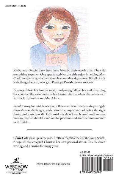 Kirby and Gracie have been best friends their whole life. They do everything together. One special activity the girls enjoy is helping Mrs. Clark, an elderly lady in their church whom they dearly love. But all of this is challenged when a new girl, Penelope Parrish, moves to town. Penelope thinks her family's wealth and prestige allows her to do anything she chooses. She soon finds she has crossed the line when she messes with Kirby's little brother and Mrs. Clark. Stand, a story for middle readers, follows two best friends as they struggle through new challenges, understand the importance of doing the right thing, and learn how the Lord works in their lives. It communicates the message that all should stand on the promises and truths communicated in the Bible.