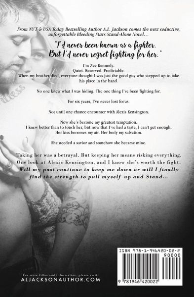 A seductive, unforgettable rockstar romance from NYT and USA Today bestselling author A.L. Jackson Zachary Kennedy has never been known as a fighter, but he'll never regret fighting for her... I'm Zee Kennedy. Quiet. Reserved. Predictable. When my brother died, everyone thought I was just the good guy who stepped up to take his place in the band. No one knew what I was hiding. The one thing I've been fighting for. For six years, I've never lost focus. Not until one chance encounter with Alexis Kensington. Now she's become my greatest temptation. I knew better than to touch her, but now that I've had a taste, I can't get enough. Her kiss becomes my air. Her body my salvation. She needed a savior and somehow she became mine. Taking her was a betrayal. But keeping her means risking everything. One look at Alexis Kensington, and I know she's worth the fight. Will my past continue to keep me down or will I finally find the strength to pull myself up and Stand...