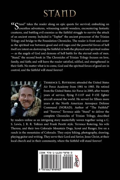 "Stand" takes the reader along on epic quests for survival; embarking on countless adventures, witnessing untold wonders, encountering fantastic creatures, and battling evil enemies as the faithful struggle to survive the attack of an ancient enemy. Included is "Tophet" the ancient precursor of the Trinian Trilogy and bridge to the Foundation Chronicles. The reader is front and center as the spiritual war between good and evil rages and the powerful forces of hell itself are intent on destroying the faithful in both the physical and spiritual realms - as the angels of God and demons of hell battle for the eternal souls of men. "Stand," the second book in The Chronicles of Trinian Trilogy focuses on love, family, and faith; and will leave the reader satisfied, edified, and strengthened in their faith. No matter what is to come, God and the spiritual forces of good are in control, and the faithful will stand forever! Terrence L. Rotering attended the United States Air Force Academy from 1981 to 1985. He retired from the United States Air Force in 2005, after twenty years of service, flying F-111F and F-15E fighter aircraft around the world. He served for fifteen more years at the North American Aerospace Defense Command (NORAD). Author of "The Faithful" and "Forever," Terrence adds "Stand" to deliver the complete Chronicles of Trinian Trilogy, described by readers online as an intriguing story masterfully woven together using a C. S. Lewis, J. R. R. Tolkien and Frank Peretti style. Terrence Rotering, his wife Theresa, and their two Colorado Mountain Dogs, Scout and Ranger, live on a ranch in the mountains of Colorado. They enjoy hiking, photography, drawing, playing guitar and writing. They serve their Lord and Savior, Jesus Christ, at their local church and in their community, where the faithful will stand forever!