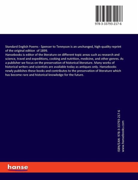 Standard English Poems - Spenser to Tennyson is an unchanged, high-quality reprint of the original edition of 1899.Hansebooks is editor of the literature on different topic areas such as research and science, travel and expeditions, cooking and nutrition, medicine, and other genres. As a publisher we focus on the preservation of historical literature. Many works of historical writers and scientists are available today as antiques only. Hansebooks newly publishes these books and contributes to the preservation of literature which has become rare and historical knowledge for the future.