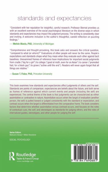 This book examines how standards and expectancies affect judgments of others and the self. Standards are points of comparison, expectancies are beliefs about the future, and both serve as frames of reference against which current events and people (including the self) are experienced. The central theme of the book is that judgments can be characterized as either assimilative or contrastive in nature. Assimilation occurs when the target of evaluation (another person, the self) is pulled toward or judged consistently with the standard or expectation, and contrast occurs when the target is differentiated from (judged in a direction opposite) the comparative frame. The book considers factors that determine whether assimilation versus contrast occurs, and focuses on the roles of contextual cues, the self, and stereotypes as standards for judging others, and the roles of internalized guides, stereotypes, and other people for judging the self.
