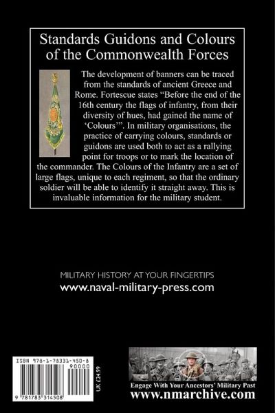 The development of banners can be traced from the standards of ancient Greece and Rome. Fortescue states "Before the end of the 16th century the flags of infantry, from their diversity of hues, had gained the name of ‘Colours’". In military organisations, the practice of carrying colours, standards or guidons are used both to act as a rallying point for troops or to mark the location of the commander. The Colours of the Infantry are a set of large flags, unique to each regiment, so that the ordinary soldier will be able to identify it straight away. This is invaluable information for the military student. The historical association of Regimental Colours and the fact that they embody the traditions of famous regiments ensure for them the interest, not only of service men, but of all interested in matters military. "A standard book on this subject," writes Sir Gerald Wollaston, Inspector of Regimental Colours, in his Foreword, "has long been needed, a book of reference both for the initiated and the uninitiated giving information concerning the origin and meaning of Colours and the regulations that govern them." Here is a well documented book with authoritative statements which can be accepted as standard work on this important and interesting subject. The compilation of this book necessitated over thirty years’ research, and it covers a wide range of kindred historical matters associated with Colours.