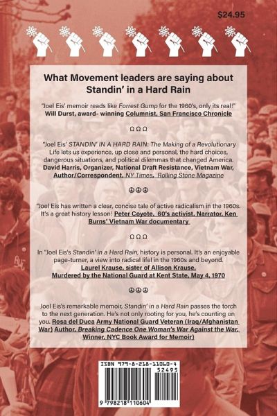 "Standin' in a Hard Rain" is the fast paced, personal, "boots-on-the-ground," front line account of major events by a dedicated radical in the 1960's (and beyond) who found himself at the table with the planners and out in the street, running from the cops. It tells the story of how and why an ordinary suburban kid became a committed radical who was with the Freedom Riders in the Deep South, the Strike of '68 at S.F. State University (the longest, most violent student strike in American History) the Draft Resistance with David Harris and Joan Baez, the Grape Strike with Caesar Chavez, Angela Davis, Eldridge Cleaver and the Panthers. I faced a bayonet at my own throat from the National Guard at Berkeley's People's Park. Standin' in a Hard Rain traces the difficult transition after this revolutionary period of a generation trying to do something productive with our lives in a country in which we felt alienated. It ends with me burning my draft card at the age of 73.