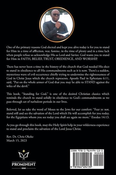 One of the primary reasons God elected and kept you alive today is for you to stand for Him in a time of affliction, war, famine, in the time of plenty and in a time lack when people refuse so acknowledge His as Lord and Savior. God wants you to stand for Him in FAITH, BELIEF, TRUST, OBEDIENCE, AND WORSHIP. There has never been a time in the history of the church that God needed His elect to stand in obedience to all His commandments such as it is now. There's a sudden, mysterious wave of evil occurrence chiefly trying to undermine the righteousness of God in Christ Jesus which the church represents. Apostle Paul in Ephesians 6:11, said, "Put on the whole armor of God that you may be able to STAND against the wiles of the devil." This book, "Standing for God," is one of the desired Christian classics which reminds the church to stand solidly in obedience to God's commandments as we pass through set of turbulent periods in our lives. Beloved, let us take the word of Moses to the Jews for our comfort: "Fear ye not, stand still and see the salvation of the Lord which He will accomplish for you today, for the Egyptians whom you see today you shall see again no more." Exodus 14:13. As you go through this book, may the Holy Spirit help in your wilderness experience to stand and proclaim the salvation of the Lord Jesus Christ. Rev. Dr. Chris Okeke March 15, 2023 One of the primary reasons God elected and kept you alive today is for you to stand for Him in a times of affliction, war, famine, in the time of plenty and in a time lack when people refuse to acknowledge Him as Lord and Savior. God wants you to stand for Him in FAITH, BELIEF, TRUST, OBEDIENCE, AND WORSHIP. There has never been a time in the history of the church that God needed His elect to stand in obedience to all His commandments such as it is now. There's a sudden, mysterious wave of evil occurrences chiefly trying to undermine the righteousness of God in Christ Jesus which the church represents. Apostle Paul in Ephesians 6:11, said, "Put on the whole armor of God that you may be able to STAND against the wiles of the devil." This book, "Standing for God," is one of the desired Christian classics which reminds the church to stand solidly in obedience to God's commandments as we pass through sets of turbulent periods in our lives. Beloved, let us take the word of Moses to the Jews for our comfort: "Fear ye not, stand still and see the salvation of the Lord which He will accomplish for you today, for the Egyptians whom you see today you shall see again no more." Exodus 14:13 As you go through this book, may the Holy Spirit help in your wilderness experience to stand and proclaim the salvation of the Lord Jesus Christ. Rev. Dr. Chris Okeke