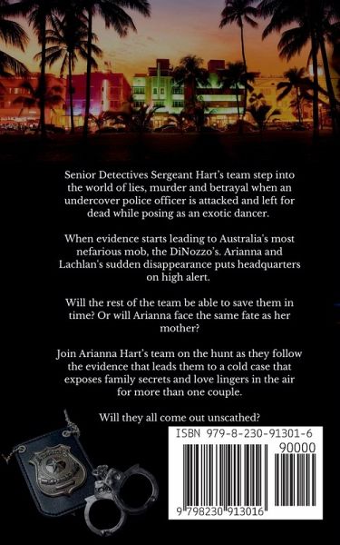 Senior Detectives Sergeant Hart's team step into the world of lies, murder and betrayal when an undercover police officer is attacked and left for dead while posing as an exotic dancer. When evidence starts leading to Australia's most nefarious mob, the DiNozzo's. Arianna and Lachlan's sudden disappearance puts headquarters on high alert. Will the rest of the team be able to save them in time? Or will Arianna face the same fate as her mother? Join Arianna Hart's team on the hunt as they follow the evidence that leads them to a cold case that exposes family secrets and love lingers in the air for more than one couple. Will they all come out unscathed?