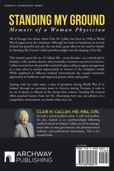 All of Europe was ablaze when Clair M. Callan was born in 1940 as World War II raged across the continent. Although her home in Sandycove in neutral Ireland was peaceful and safe, the war had a great effect on her and her family. In Standing My Ground, Callan provides insight into the shaping of her life. This memoir spans the arc of Callan’s life—seven decades—as a school girl in Ireland, a wife, mother, doctor, and eventually a business executive in America. Callan recounts how she partially cracked the glass ceiling to upper management at a time when it seemed impenetrable to women in the workplace world. While employed in different medical environments she created innovative approaches to healthcare and improved patient safety and quality. Starting with her early years, a time of privation during World War II in Ireland, through an uncertain move to America during Vietnam, it ends in an era of plenty in Illinois in the twenty-first century. Standing My Ground offers practical lessons from her life, illustrating how one can advance in a competitive environment, no matter what one’s sex.