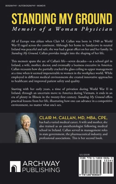 All of Europe was ablaze when Clair M. Callan was born in 1940 as World War II raged across the continent. Although her home in Sandycove in neutral Ireland was peaceful and safe, the war had a great effect on her and her family. In Standing My Ground, Callan provides insight into the shaping of her life. This memoir spans the arc of Callan’s life—seven decades—as a school girl in Ireland, a wife, mother, doctor, and eventually a business executive in America. Callan recounts how she partially cracked the glass ceiling to upper management at a time when it seemed impenetrable to women in the workplace world. While employed in different medical environments she created innovative approaches to healthcare and improved patient safety and quality. Starting with her early years, a time of privation during World War II in Ireland, through an uncertain move to America during Vietnam, it ends in an era of plenty in Illinois in the twenty-first century. Standing My Ground offers practical lessons from her life, illustrating how one can advance in a competitive environment, no matter what one’s sex.