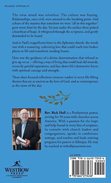 The virus attack was relentless. The culture was fraying. Relationships, once civil, were stressed to the breaking point. And echoes of the mantra that somehow we were "all in this together" grew more faint by the day. Yet just under the surface there pulsed a heartbeat of hope. It whispered through the scriptures, and gently demanded to be heard. And in Paul's magnificent letter to the Ephesian church, the words rose with a reassuring, redeeming love that could reach into broken places to lift and transform needing hearts. Here was the guidance of a divine determination that refused to give up on us -- offering a way of living that could heal old wounds, reconcile painful separations, and face down life's destructive forces with spiritual courage and strength. These short focused reflections immerse readers in seven life-lifting themes that are as ancient as the love of God, and as contemporary as the news of the day.