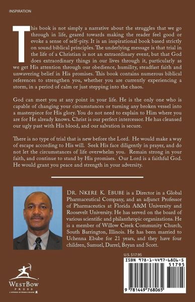 This book is not simply a narrative about the struggles that we go through in life, geared towards making the reader feel good or evoke a sense of self-pity. It is an inspirational book based strictly on sound biblical principles. The underlying message is that trial in the life of a Christian is not an extraordinary event, but that God does extraordinary things in our lives through it, particularly as we get His attention through our obedience, humility, steadfast faith and unwavering belief in His promises. This book contains numerous biblical references to strengthen you, whether you are currently experiencing a storm, in a period of calm or just stepping into the chaos. God can meet you at any point in your life. He is the only one who is capable of changing your circumstances or turning any broken vessel into a masterpiece for His glory. You do not need to explain to Him where you are for He already knows. Christ is our perfect intercessor. He has cleansed our ugly past with His blood, and our salvation is secure. There is no type of trial that is new before the Lord. He would make a way of escape according to His will. Seek His face diligently in prayer, and do not let the circumstances of life overwhelm you. Remain strong in your faith, and continue to stand by His promises. Our Lord is a faithful God. He would grant you peace and strength in your adversity.