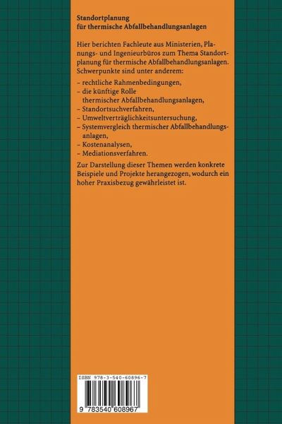 Hier berichten Fachleute aus Ministerien, Planungs- und Ingenieurbüros zum Thema Standortplanung für thermische Abfallbehandlungsanlagen . Schwerpunkte sind unter anderem: - rechtliche Rahmenbedingungen, - die künftige Rolle thermischer Abfallbehandlungsanlagen, - Standortsuchverfahren, - Umweltverträglichkeitsuntersuchung, - Systemvergleich thermischer Abfallbehandlungsanlagen, - Kostenanalysen, - Mediationsverfahren. Zur Darstellung dieser Themen werden konkrete Beispiele und Projekte herangezogen, woduch ein hoher Praxisbezug gewährleistet ist.