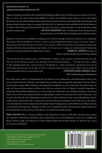 Stanislavsky and Female Actors is the exploration of Stanislavsky's artistic and personal relationship with the leading actresses of the Moscow Art Theatre. It seeks to portray their life-long artistic dialogue and offers a new biographical study of the previously unknown spheres of Stanislavsky's life, as well as the lives of the Moscow Art Theatre's principal actresses.